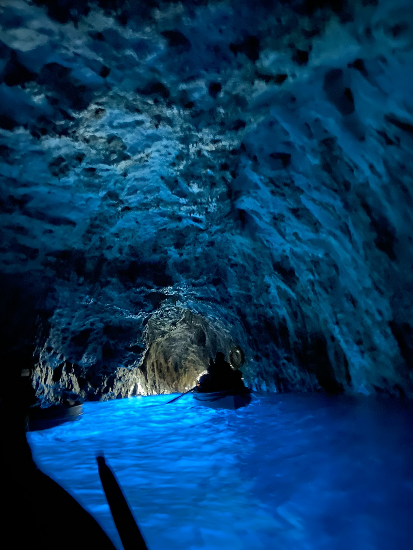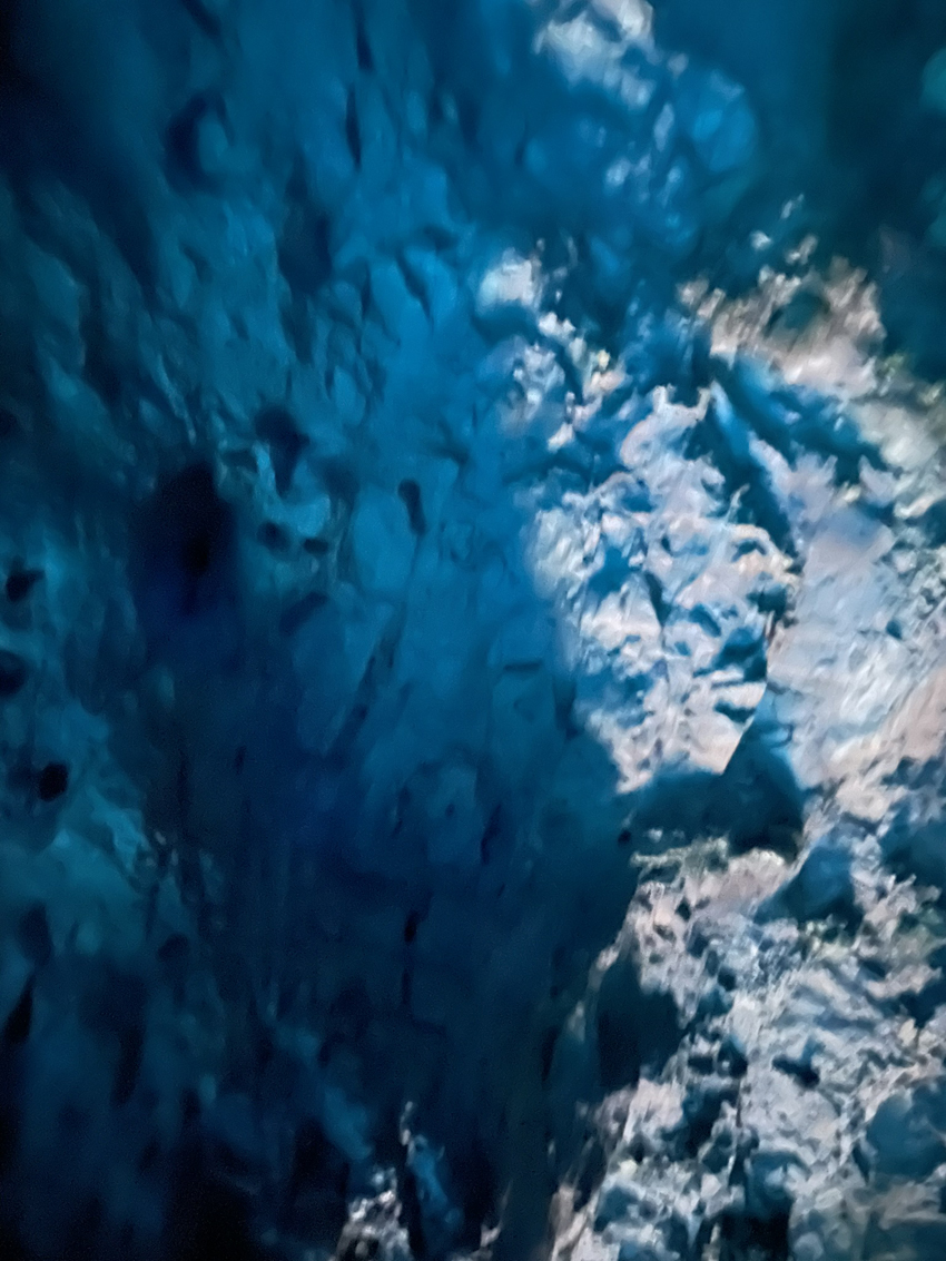 Một hang động biển tuyệt đẹp, nơi ánh sáng mặt trời xuyên qua các khe hở dưới nước, tạo ra những phản chiếu màu xanh rực rỡ.
