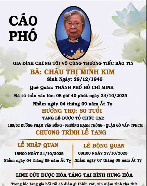 Thành Kính Phân Ưu Cùng Tang Quyến Cô Châu Thị Minh Kim.