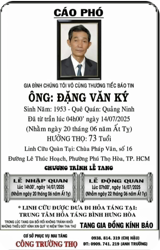 Kính Mời quý ACE cố gắng sắp xếp thời gian đến chia buồn, tiễn đưa Ông Đặng Văn Ký về nơi an nghỉ cuối cùng!!