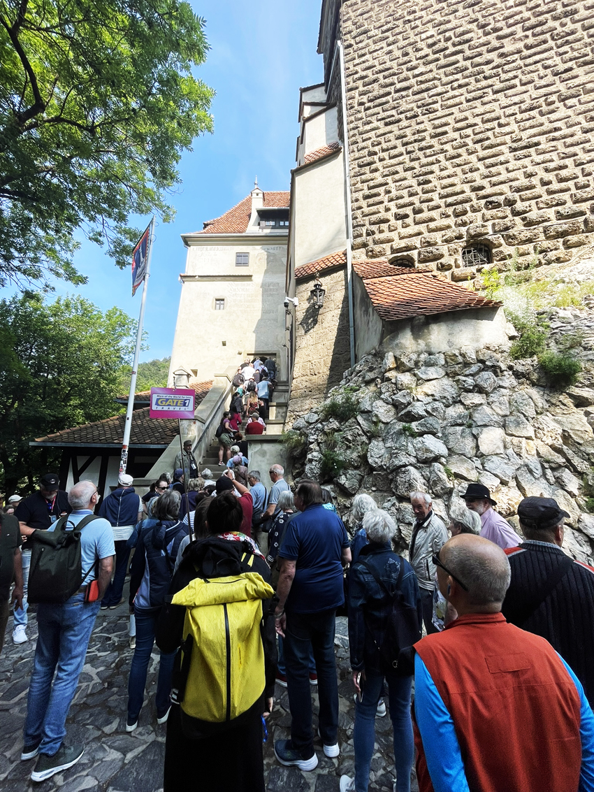 Du khách leo lên chiếc cầu thang hẹp bắt đầu vào bên trong tòa lâu đài.
