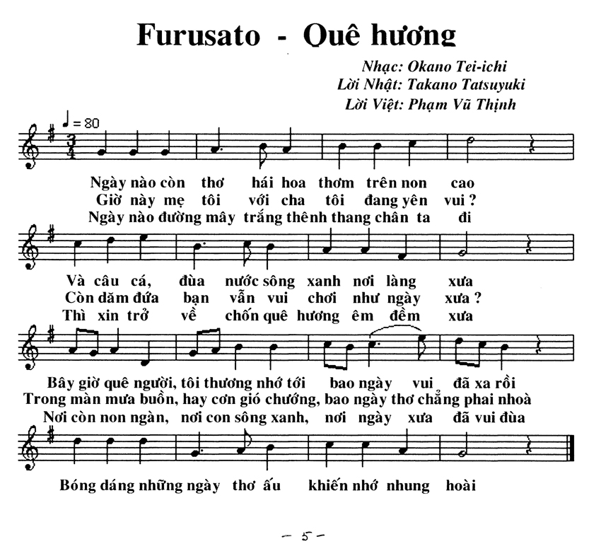 Xin giới thiệu Furusato - 故郷 - Quê Hương nhạc của Okano Tei-ichi, lời của Takano Tatsuyuki, cùng với lời Việt như một phụ họa vì ngưỡng mộ ̣và lời Anh/Mỹ. Ca nhạc sỹ Mỹ Greg Irwin đã viết lời nhạc Anh/Mỹ "My Country Home" vừa gần với lời Nhật nguyên tác vừa trôi chảy hòa hợp với điệu nhạc mà vẫn tạo được ấn tượng tự nhiên cứ như là nhạc gốc Mỹ."