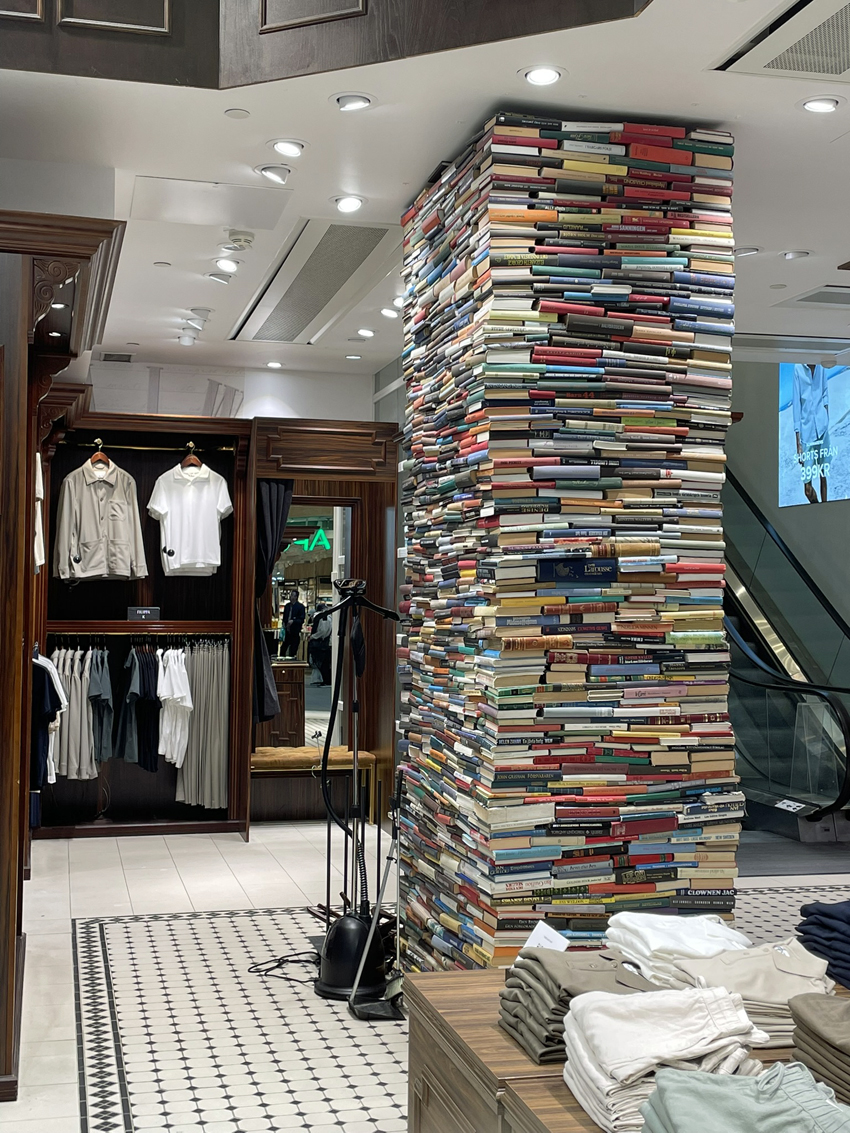 Tại một tiệm quần áo, có một cây cột xếp bằng các quyển sách.