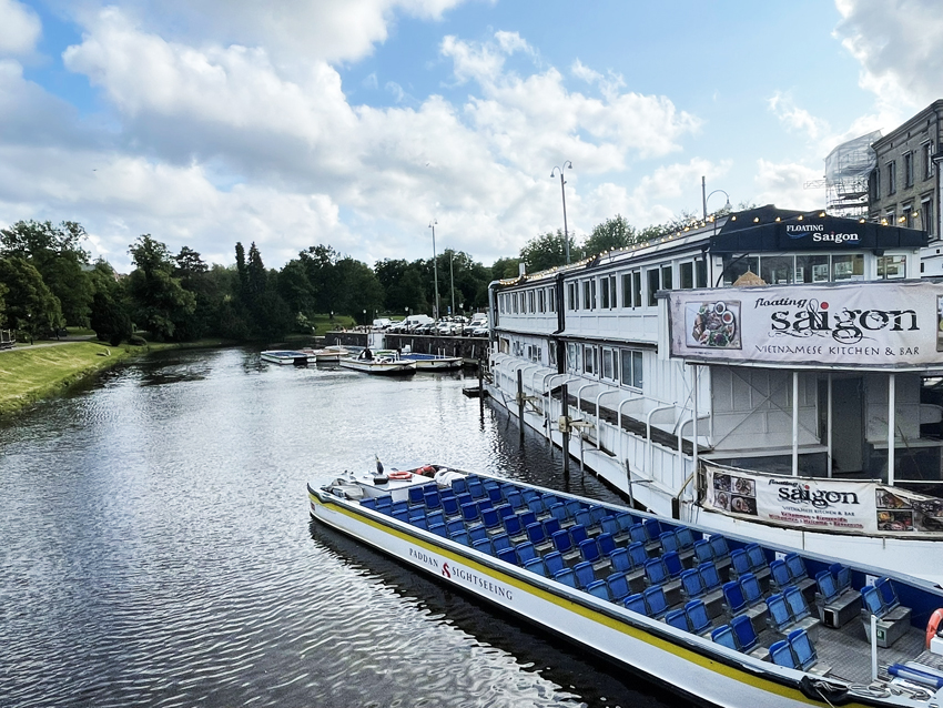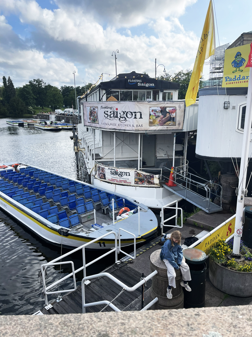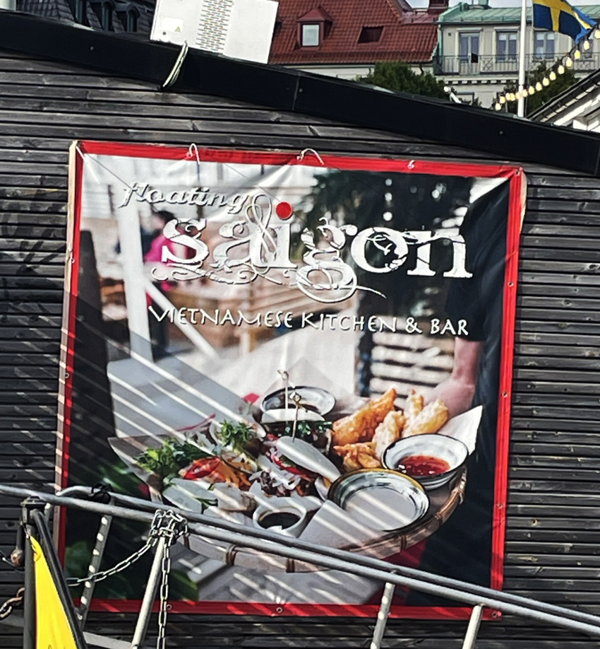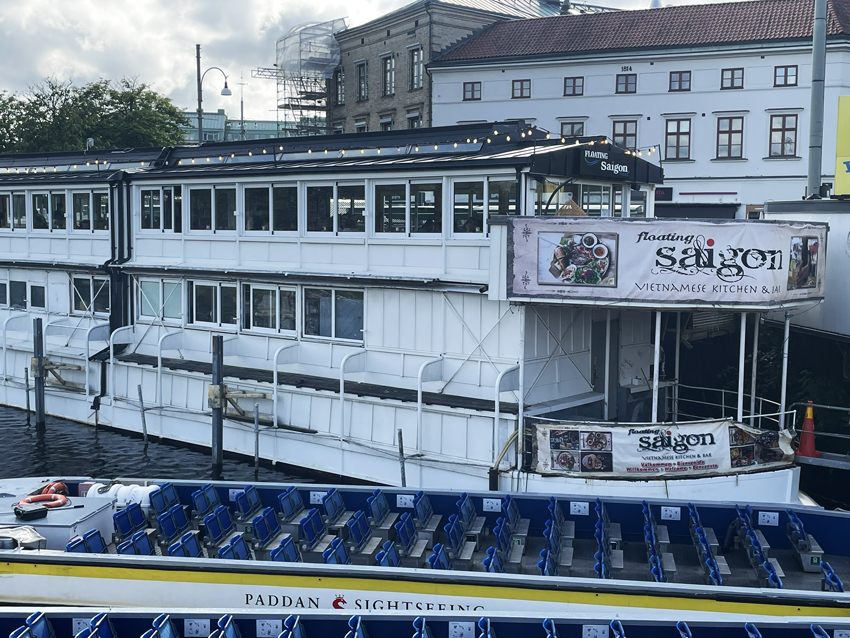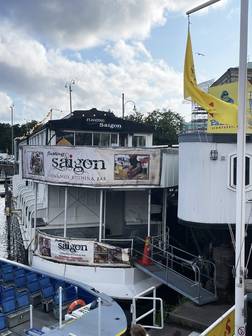 Ngay đầu con kênh nước, có nhà hàng Việt Nam tên là "Floating Saigon"