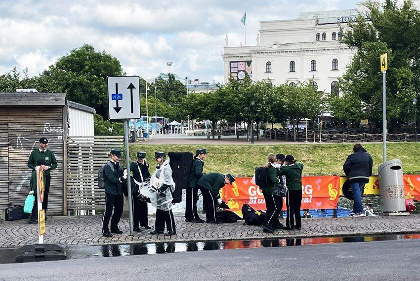 Ban nhạc giúp vui cho những chuyến du lịch bằng tàu theo dọc con kinh đang thu dọn đồ nghề sau chuyến đi.