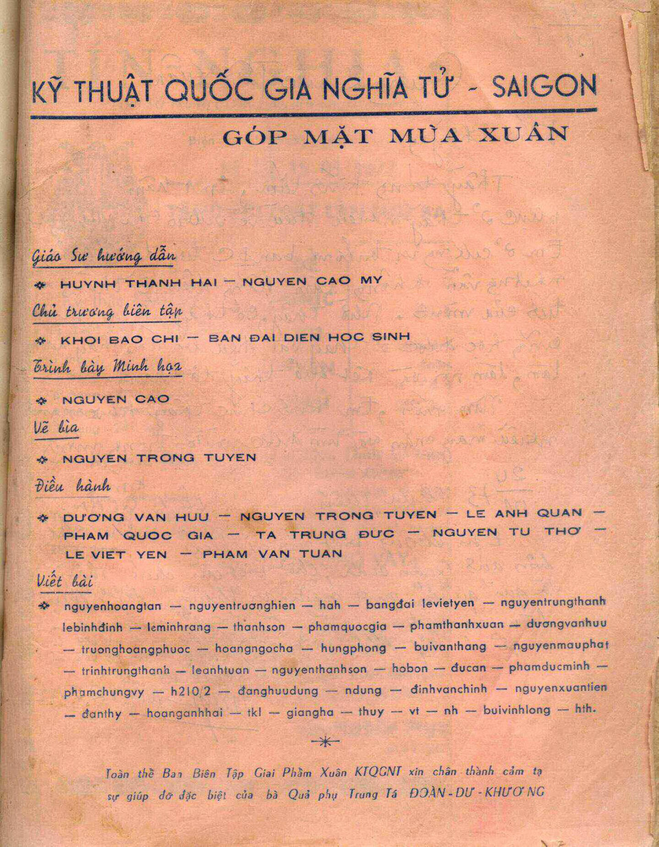 (Trang Nhà Gia Đình Quốc Gia Nghĩa Tử xin chân thành cảm ơn giáo sư Đỗ Trọng Hoà (Nhật Bản) đã gởi cho các bài viết của thầy Huỳnh Thanh Hải, cùng là giáo sư trường Trung học Kỹ Thuật QGNT. Các bài viết ký nhiều tên tác giả, nhưng theo thầy Hoà, chỉ là một thầy Huỳnh Thanh Hải.)