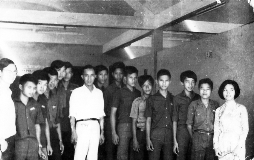 -Từ trái qua : Thày Đỗ Trọng Hoà trưởng xưởng Điện tử, Thầy Trần Khắc Lượng Tổng giám xưởng,Thầy Nguyễn Hàn Tý bộ Cựu Chiến Binh, hai nhân viên Toà Đại sứ Ý đại lợi, thầy hiệu trưởng Đặng Trần Dư, Thầy Đỗ Đại Thanh Vân giám học và Thầy Phan Tấn Chữ giáo sư điện tử.