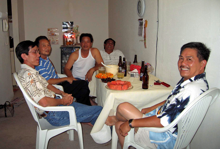 Vợ chồng Bắc ngỏ ý muốn mời bạn bè đến nhà vào ngày chị Lan được nghỉ. Các bạn khác bận vì thời gian ở Houston qua’ ít mà người quen thì nhiềụ Bắc đến khách sạn đón, vừa về đến cửa nhà thì được điện thoại cho biết Ðỗ ngọc Anh sẽ cùng 2 người bạn ghé chơi cho vuị. Nhà chỉ có 4 cái ghê’, một chiếc bàn nhỏ. Tôi đề nghị dẹp hết vào trong buồng, chừa chỗ trải báo ngồi quây quần trên thảm cho tiện việc sổ sách.