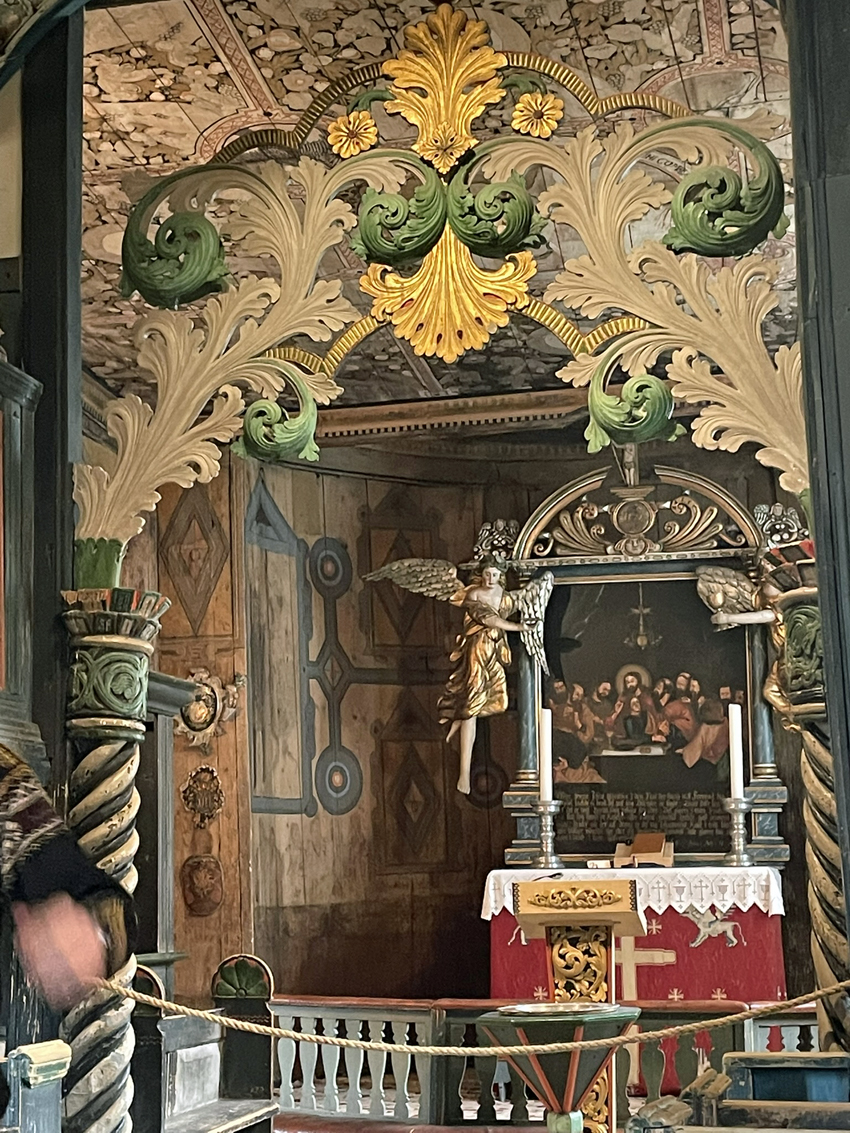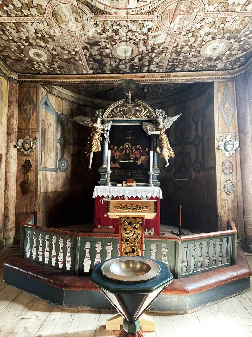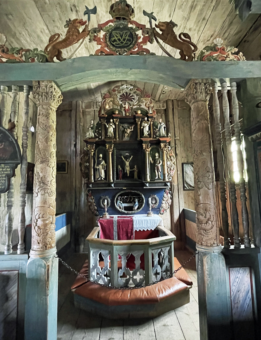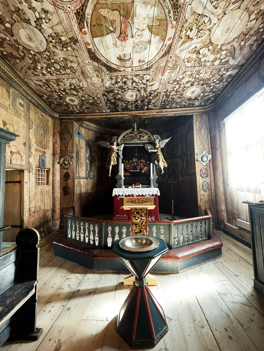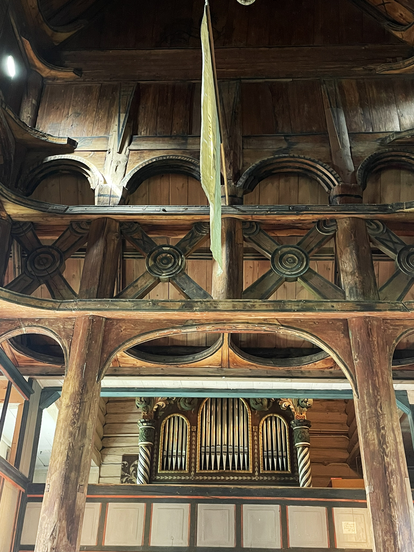 Tại ngôi làng Lom này có một nhà thờ gỗ lớn nhất và được bảo tồn tốt nhất Na Uy. Được xây dựng vào khoảng năm 1150, mặt tiền độc đáo của nhà thờ dường như được lấy cảm hứng từ một câu chuyện cổ tích thời trung cổ.