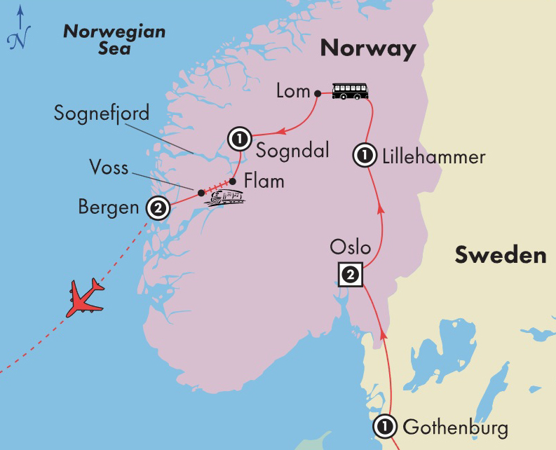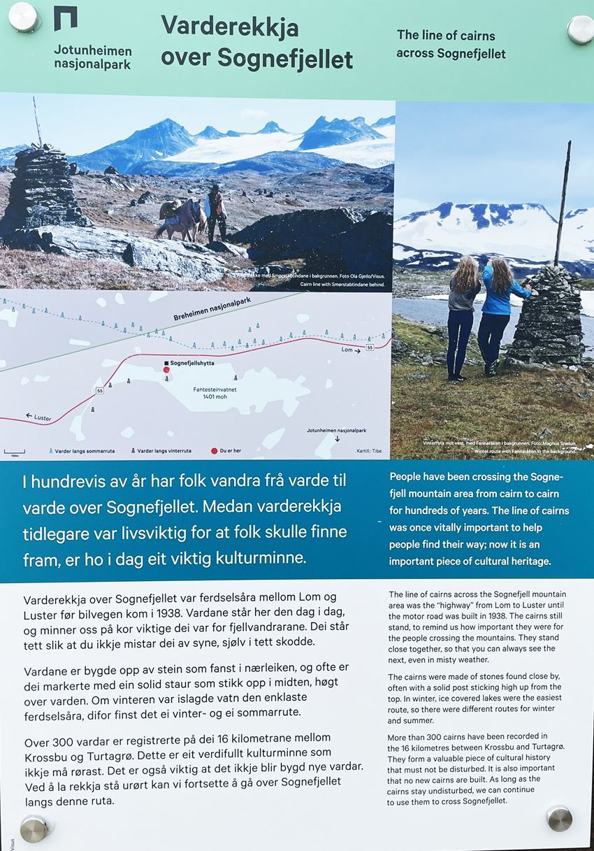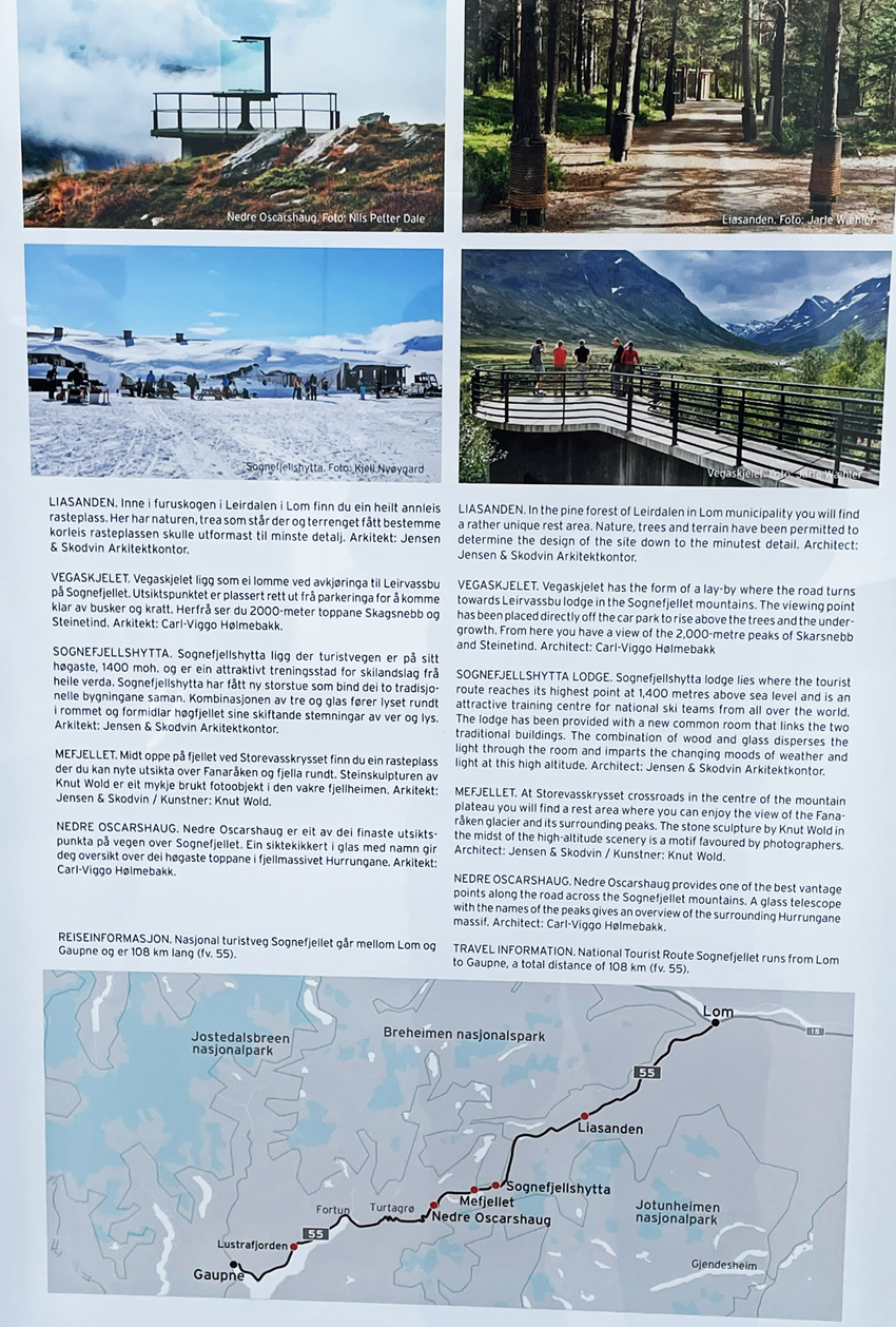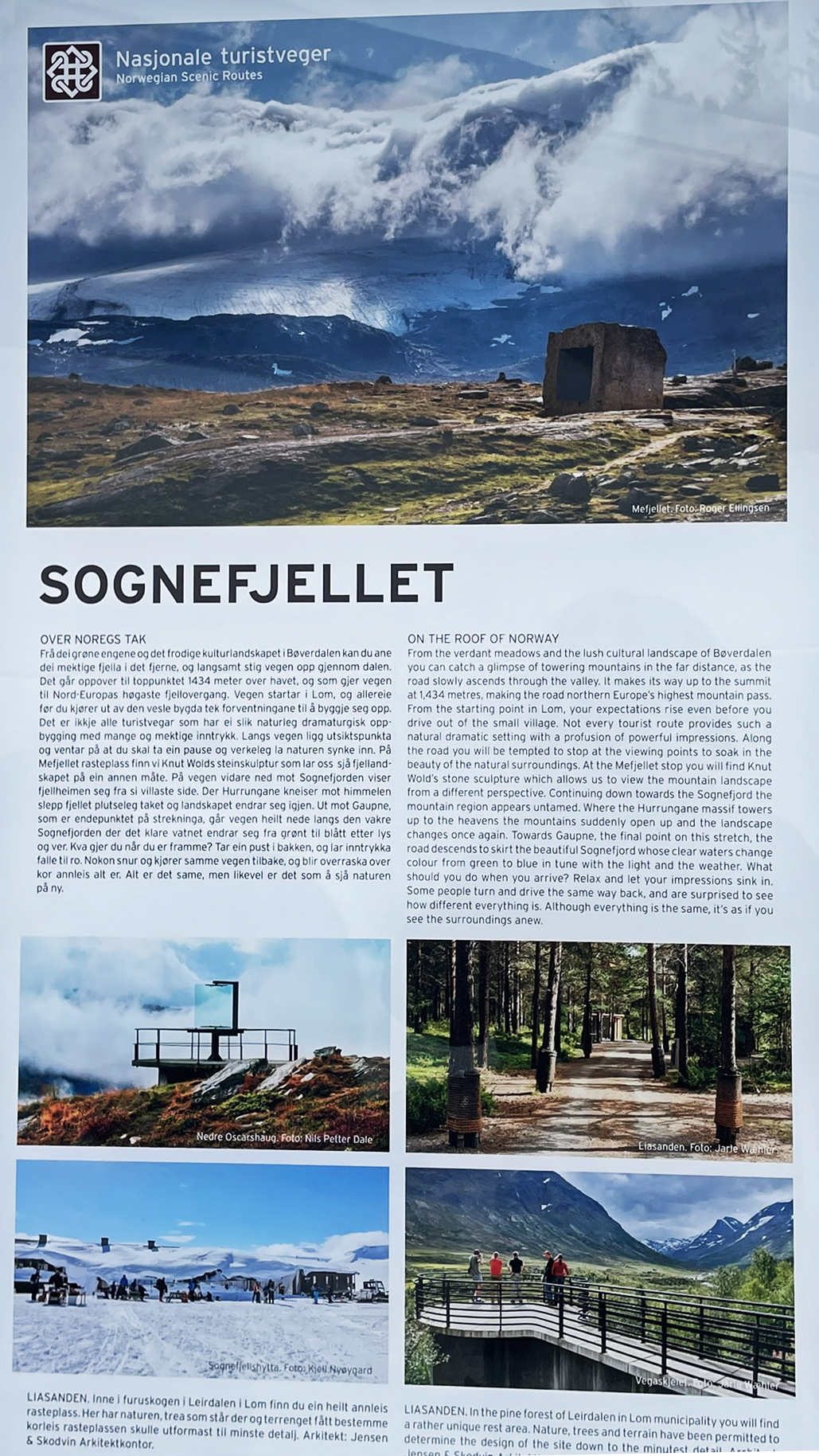 Vùng Sognefjellet là nơi có đồi núi cao nhất Bắc Âu, được mệnh danh là "nóc nhà của Na Uy", xuyên qua vùng nông thôn Na Uy hùng vĩ. Đi qua các sông băng, rừng thông và Galdhøpiggen là ngọn núi cao nhất Na Uy trong Công Viên Quốc gia Jotunheimen.