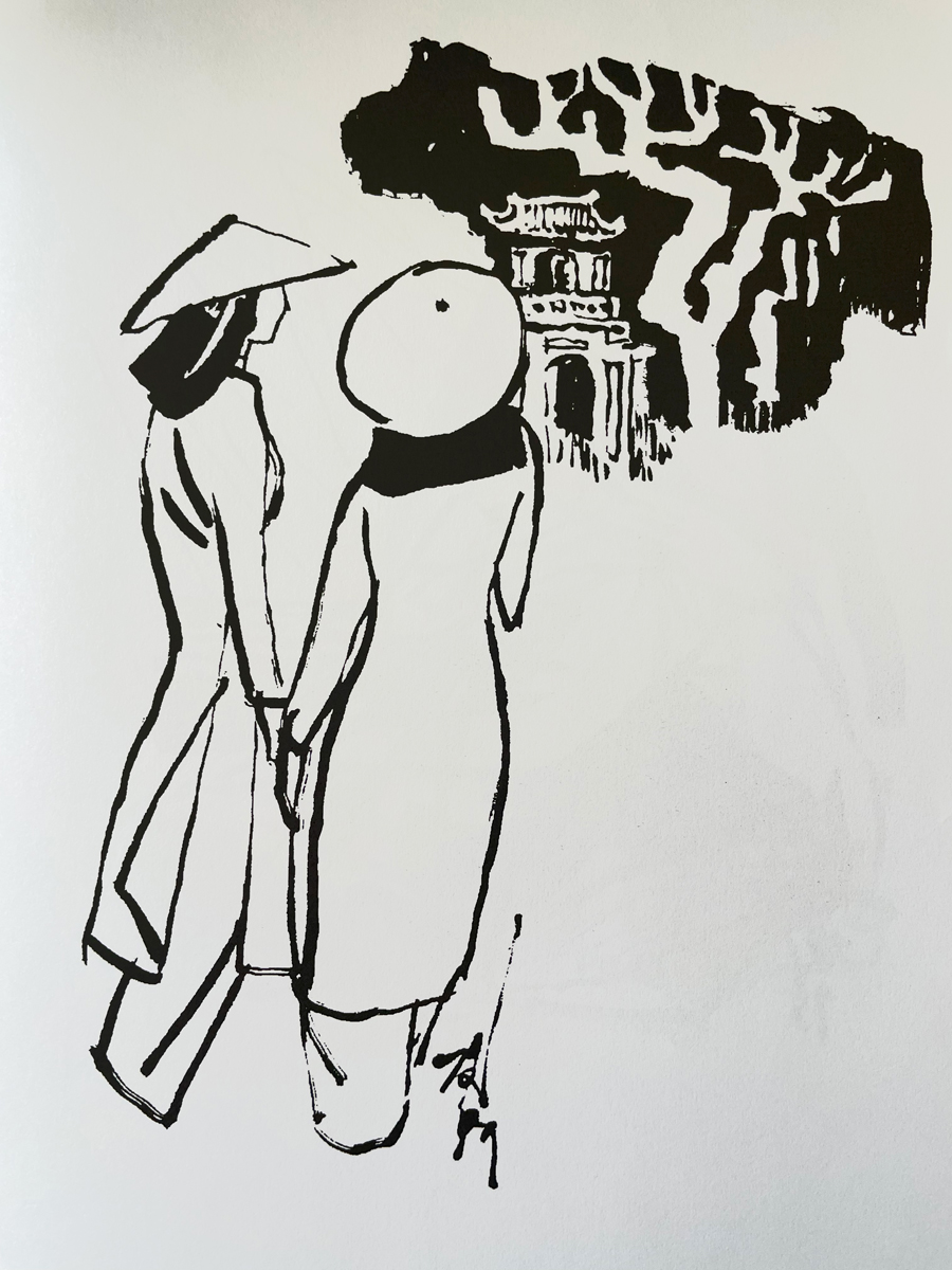 Ờ . .ờ . . học sinh tới . . Bộ CCB đằng kia để bán báo Xuân . . cho trường. Bạn ta ỡm ờ trả lời, tay chỉ miếng huy hiệu trường trên túi áo, đồng thời ngẩng đầu ra dấu hướng cổng BCCB.