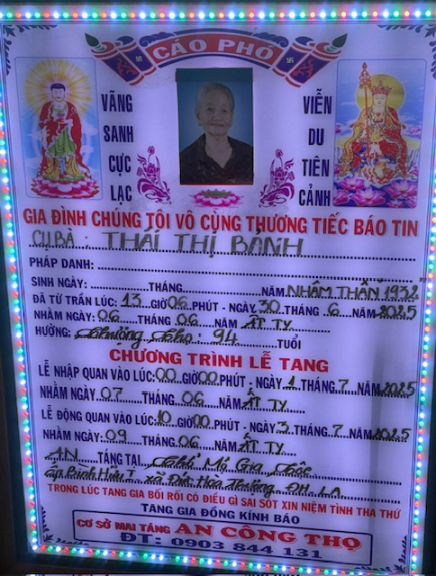 Kính Mời quý ACE cố gắng sắp xếp thời gian đến thăm viếng, tiễn đưa Cụ Bà Thái Thị Bảnh về nơi an nghỉ cuối cùng.