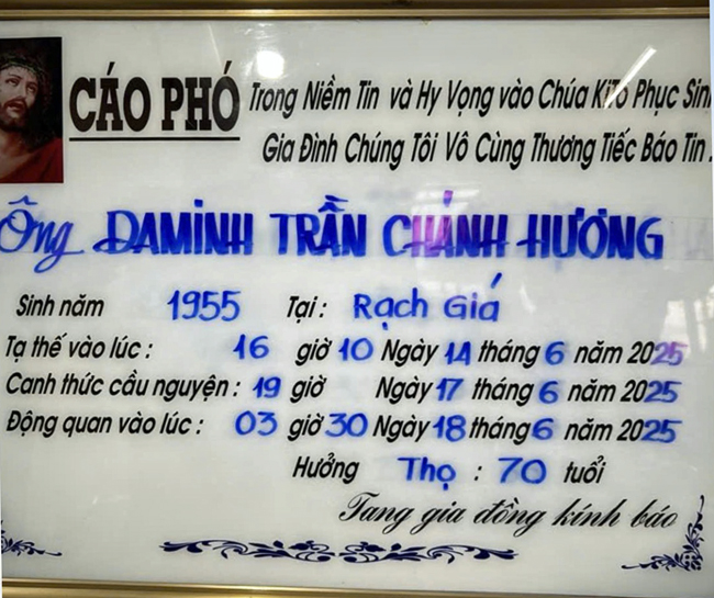 Nhận được tin buồn từ Gia Đình QGNT-SG, phu quân của bạn Vũ Minh Hoàng (Q75), Ông Đaminh Trần Chánh Hương, đã từ trần lúc 16 giờ 10, ngày 14 tháng 06 năm 2025, sau một thời gian trọng bệnh, hưởng thọ 70 tuổi.