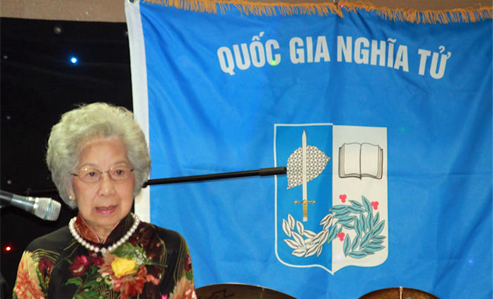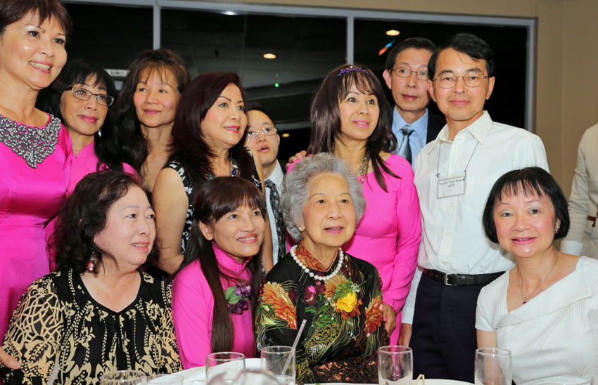 Bà Nguyễn Văn Thiệu (giữa), cựu Đệ Nhất Phu Nhân VNCH, tuổi ngoài 80 vẫn đầy phong độ. Bà đã đọc diễn văn, đến từng bàn thăm hỏi và chụp hình kỷ niệm với các cựu HS từng được xem là “con nuôi của quốc gia” trong dịp hội ngộ 40 năm Bạn Cũ Trường Xưa nầy. (Photo: qgnt.com)
