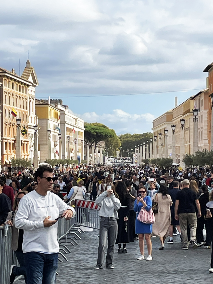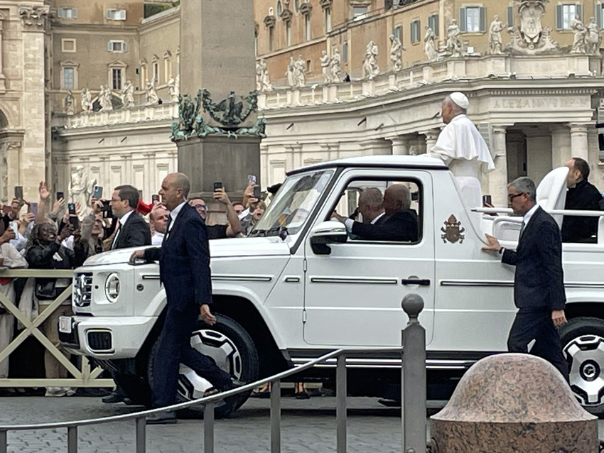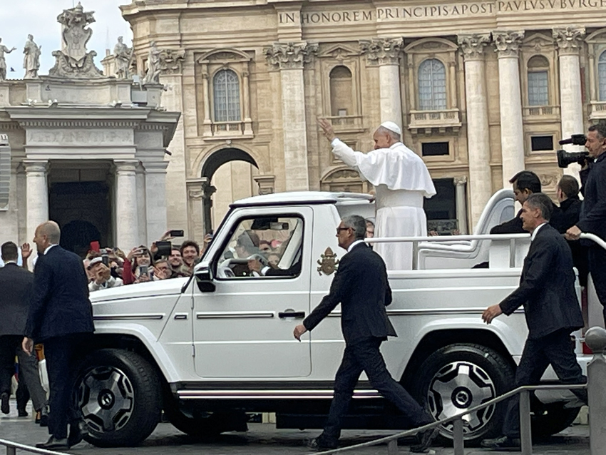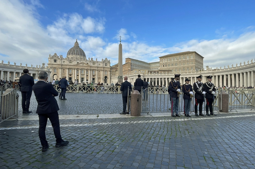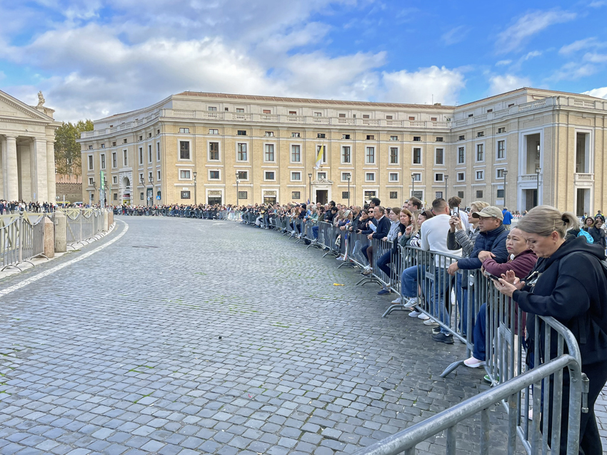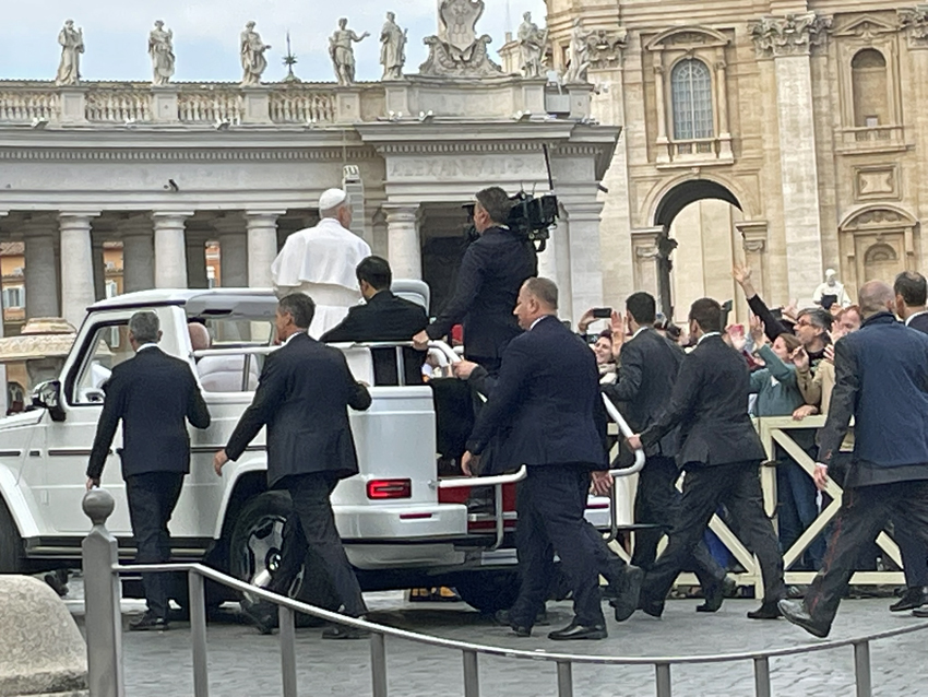 Các nhân viên đứng sẵn chờ xe chở Đức Giáo Hoàng đi qua.
