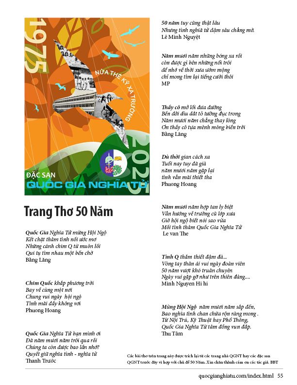 Dù là trên bờ hay dưới nước hoặc ở bất cứ nơi đâu thì linh hồn của chuyện hội ngộ vẫn là cuốn Đặc san QGNT. Nhìn lại khoảng thời gian qúa dài từ 1975 đến 2025 phải xa ngôi trường thân yêu BCH, BTC và BBT đã mạn phép chọn chủ đề ĐS là : Nửa Thế Kỷ Xa Trường. Đây là những trang giấy cho chúng ta chia sẻ, giãi bày tâm sự, cảm xúc yêu thương gia đình, thầy cô, bạn bè nơi trường xưa . . . , cũng là món qùa tặng qúi thầy cô và các ACE tham dự . BBT rất mong được ACE gửi các sáng tác, hồi ký, truyện ngắn , thơ , nhạc, kịch , hội hoạ, hình ảnh . . . về địa chỉ kèm bên dưới (Hạn chót gửi bài là ngày 30 tháng 3 năm 2025), và nếu có thể trong khả năng của mình, xin qúi ACE trợ giúp thêm cho việc ấn loát ĐS.